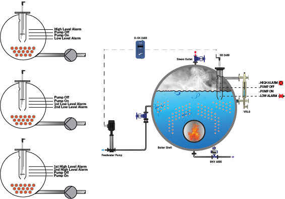The D-SK 2000 is a new generation on-off level control and alarm system for steam boilers. It operates with upgraded versions of the SD 2400 four-level capacitive probe and the D-SK 2400 controller. Powered by 24VDC, the system controls the feedwater pump and provides integrated high and low level alarm functions. Fully compliant with EN 12952 and EN 12953 standards, the D-SK 2000 is designed as the modern successor to the classic SK 2000 system, offering a compact and reliable solution.