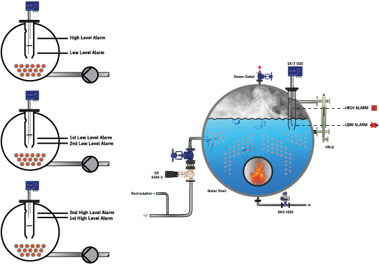 Vira Compact Level Alarm systems are used in 3 different ways. Two electrode high alarms, two electrode low alarms, one of them is high and the other one is low alarm. The SK-T 1200 Compact Level Alarm system operate on conductivity principle for providing level alarm signals in conductive liquids. The Level Controller and probe are suitable for use with different qualities of liquids such as water, condensate, boiler water. Level Alarm Systems can be used in water with an electrical conductivity as low as 10 μS/cm at 25 °C.
