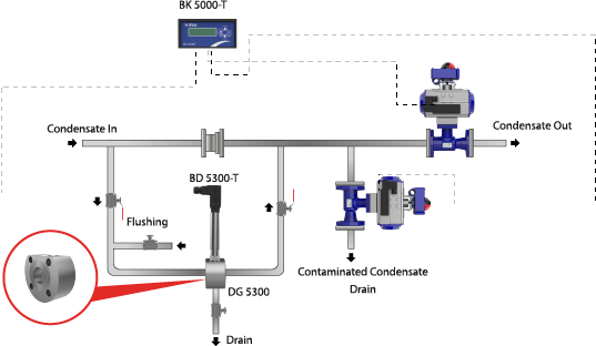 Recoverable clean condensate is a very valuable energy for steam producing enterprises. It is necessary to make sure that the condensate to be returned to the boiler room is clean. Perforation of a heat exchanger tube or plate means that the fluid to be heated mixes with the condensate. This causes the quality of the finished product to deteriorate and the returned condensate to be contaminated. Continuous control of condensate pollution means the protection of the boiler. Non-contaminated condensate means to maintain the quality of the product to be produced and to save energy. In case of any contamination, the controller sends a command to the valve to divert the condensate to the drain line and the dirty condensate is drained. In this way, the dirty condensate is prevented from returning to the condensate tank. When dirty condensate is detected, an acoustic or light alarm can be received and technical responsible can be informed.