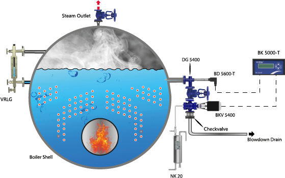 In steam boilers, TDS (Total Dissolved Solids) level is controlled more accurately and effectively with an automatic blowdown system. Temperature Compensation Type Automatic Blowdown Controller BK 5000-T measures the boiler water conductivity thanks to the Conductivity Probe BD 5600-T.