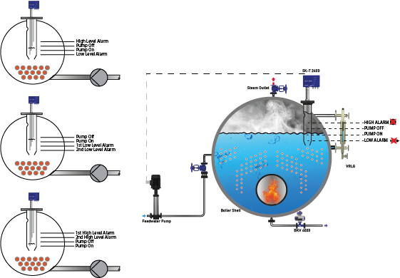 With On-Off Level Control System, Level Probes detects the water level of boiler and therefore, the integrated level controller starts or stops the feedwater pump. Besides, two alarm relay outputs can be provided.